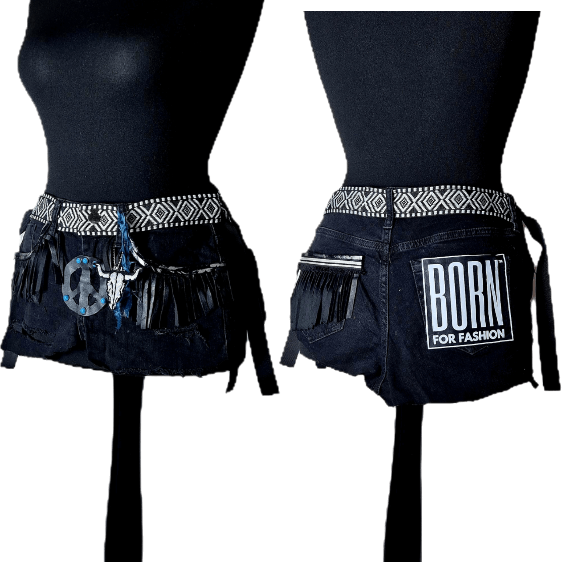 Crafted from reclaimed black denim and finished with soft leather fringe, tribal textures, and a peace symbol β this piece carries the energy of freedom, protection, and feminine fire.