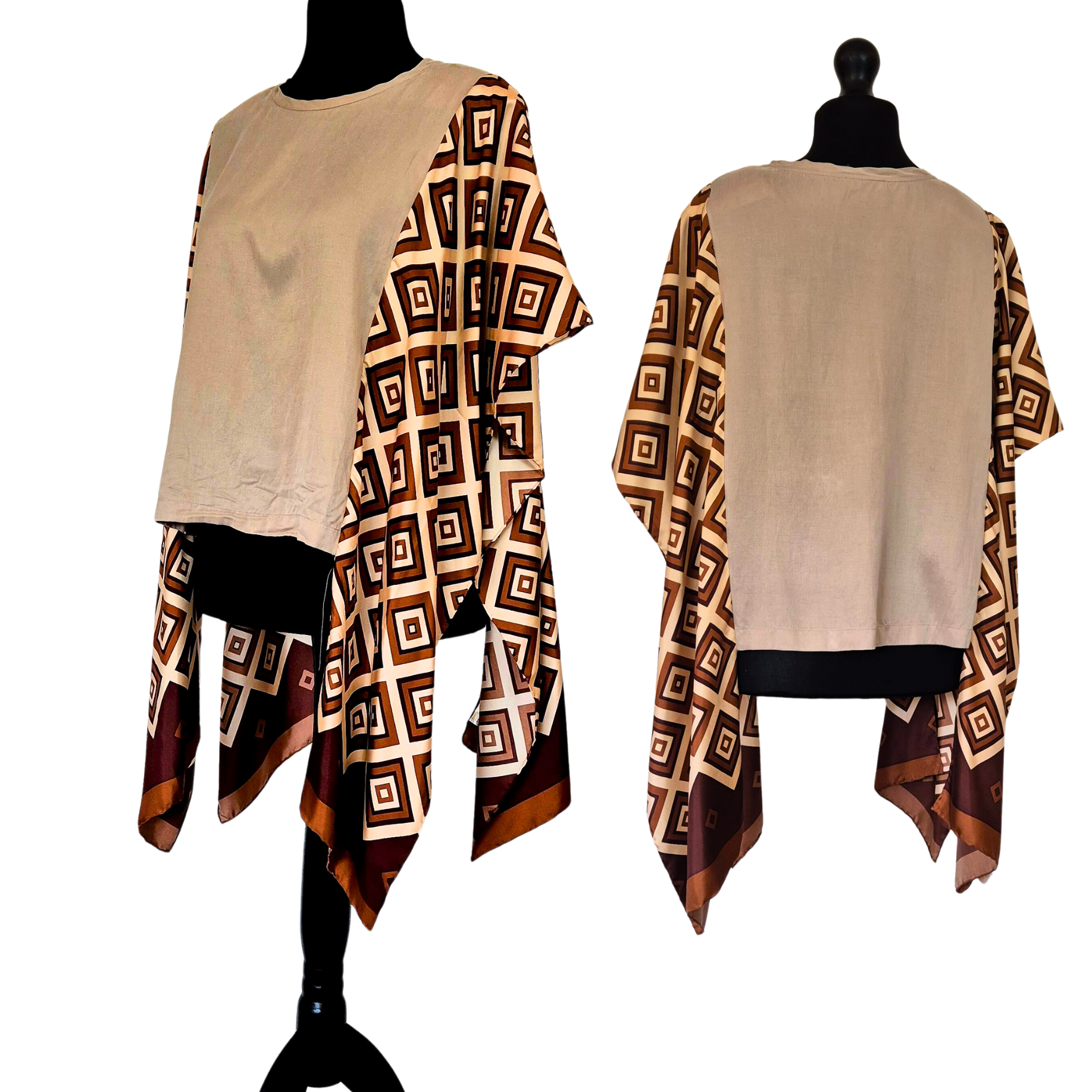 The wide-cut sleeves and geometric patterns channel a powerful, vintage-inspired aesthetic, while the soft beige center grounds the look in balance and calm. Lightweight and effortless, it’s a statement of modern tribal elegance.