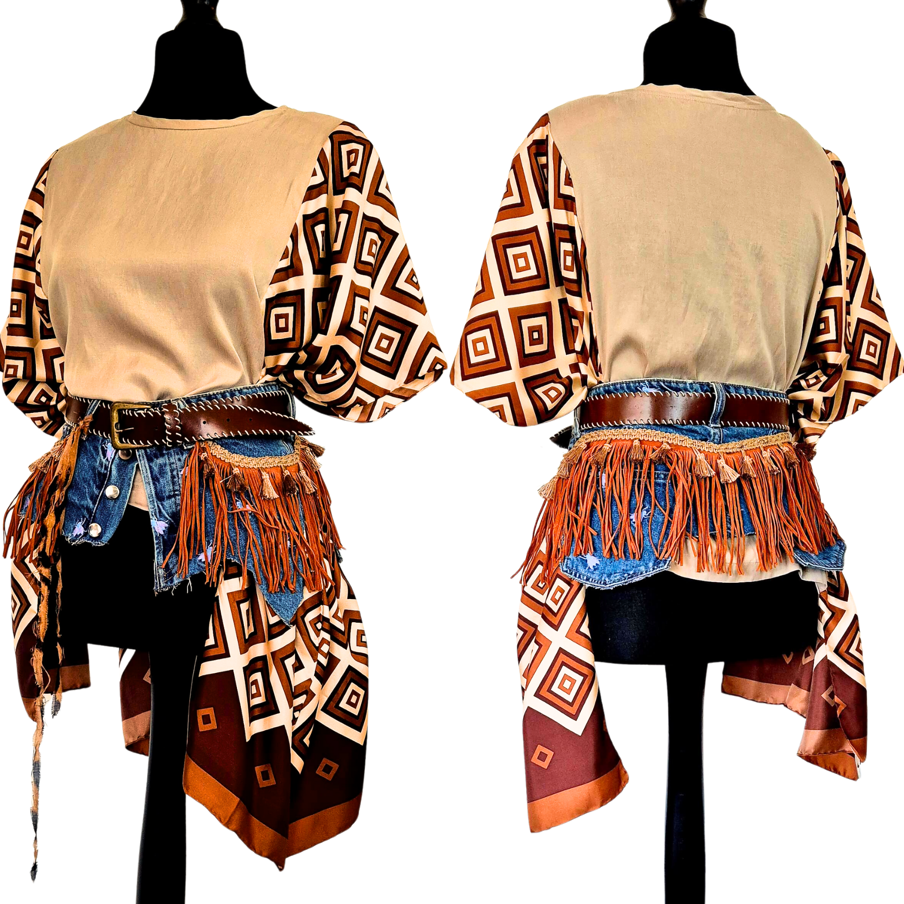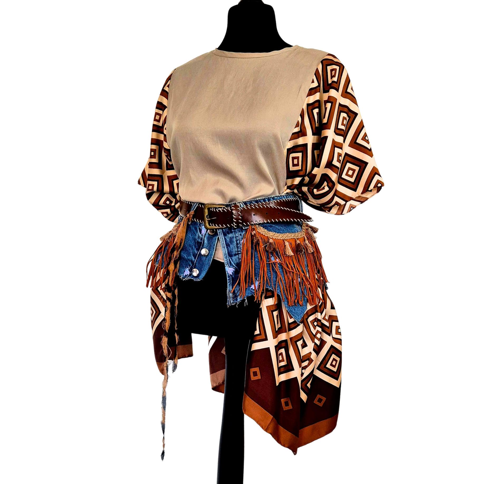 Embrace your inner wild and walk with grounded confidence in the Sahara Wings Tee. This earthy top blends warm neutral tones with bold tribal-print sleeves and a relaxed, flowing silhouette – perfect for women who honor both their strength and softness.