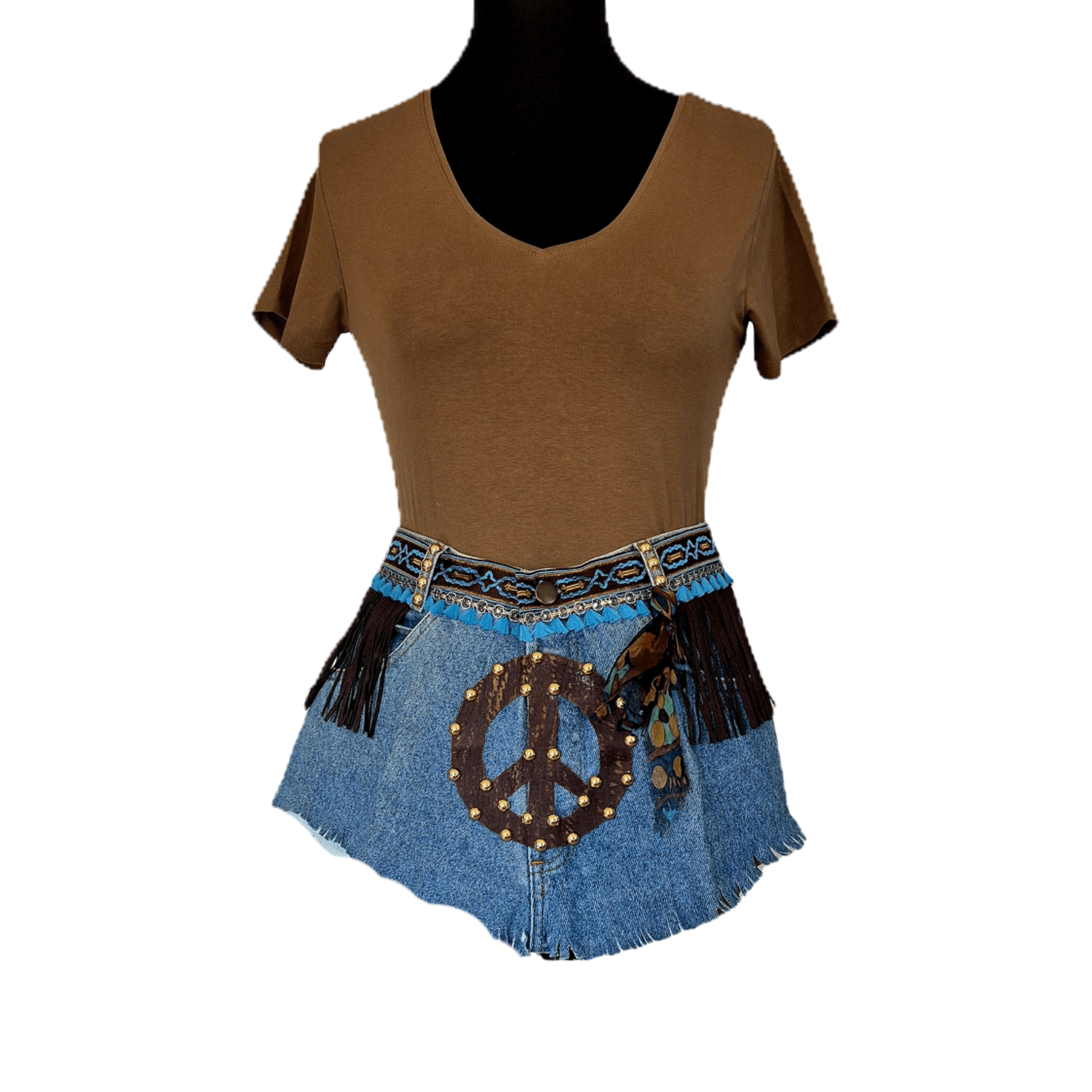 Crafted from upcycled denim, this one-of-a-kind skirtbelt features a bold, hand-cut peace symbol in soft faux leather, accented with brass studs and flowing black fringes. The tribal-style waistband adds grounding energy and completes the boho-chic look with meaning and style.