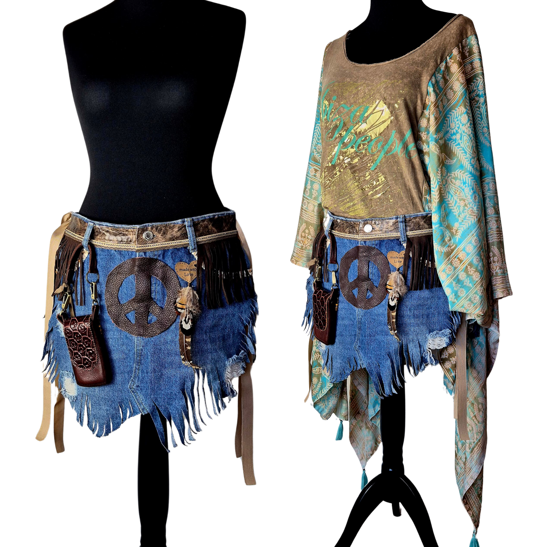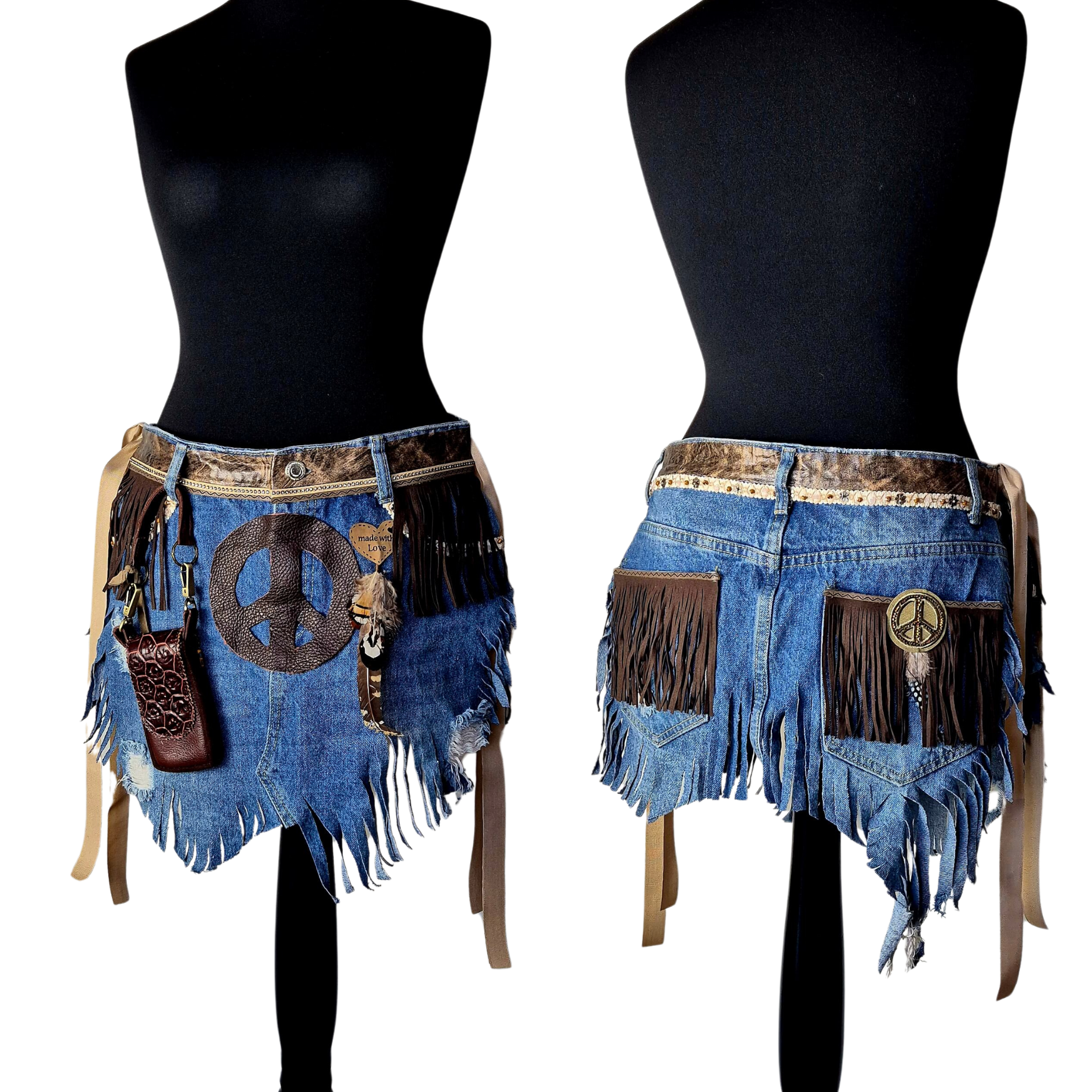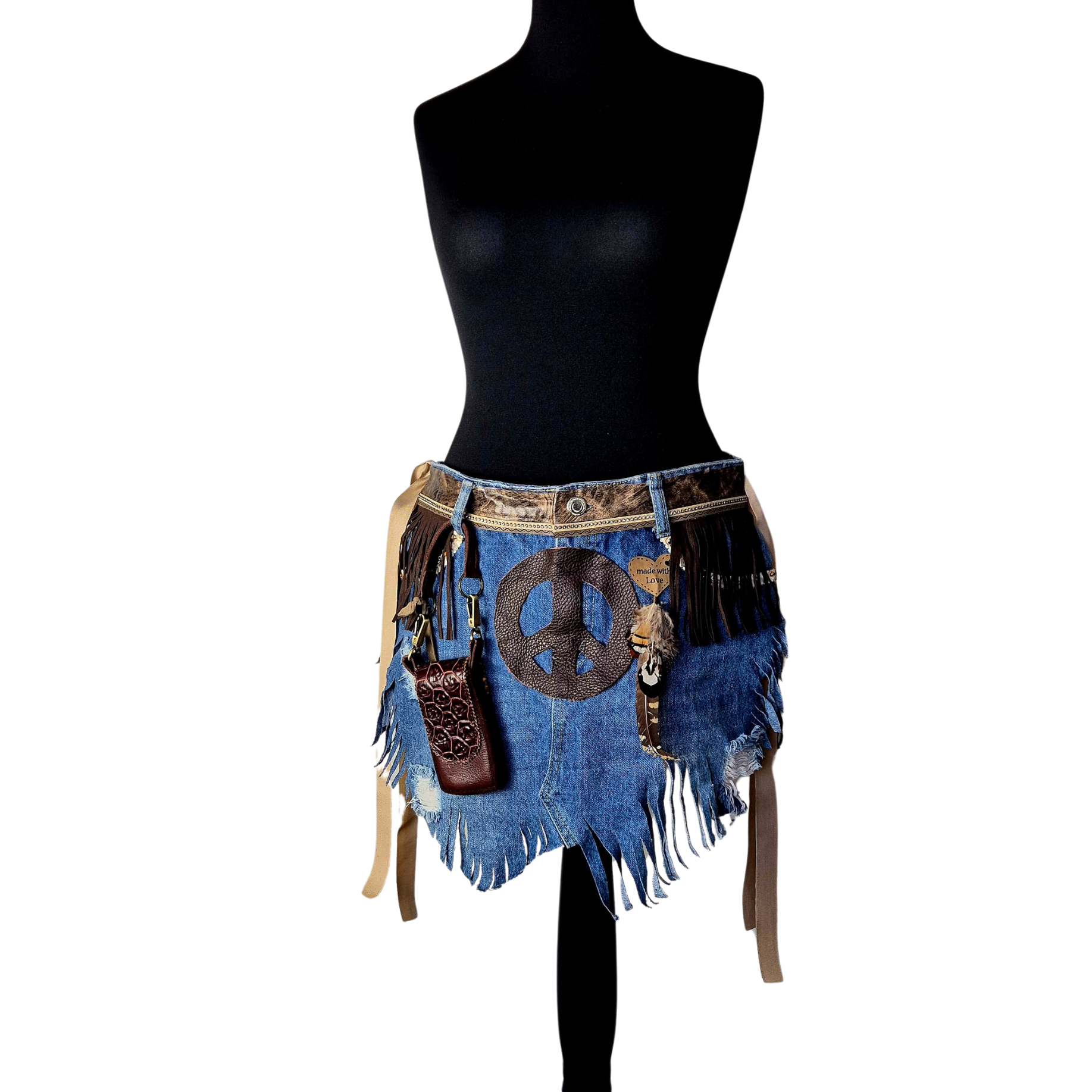 Elevate your style with the Earth Whisper Denim Belt, featuring warm brown tones, flowing brown fringes, delicate feathers, a leather pouch, and natural shell accents. Adjustable XS to L — a perfect boho layering piece full of earthy healing energy.
