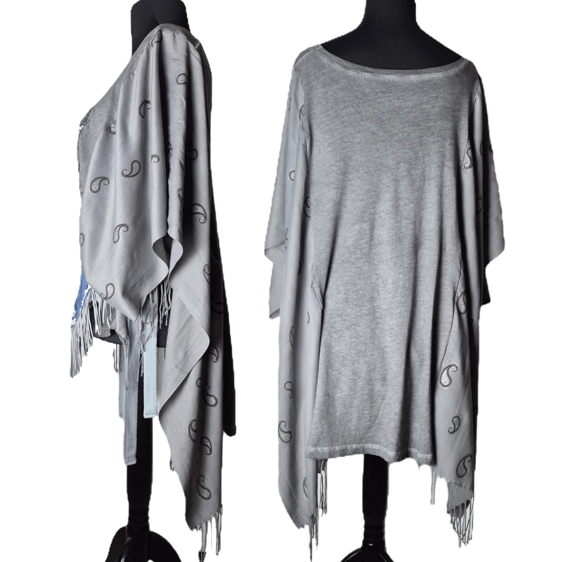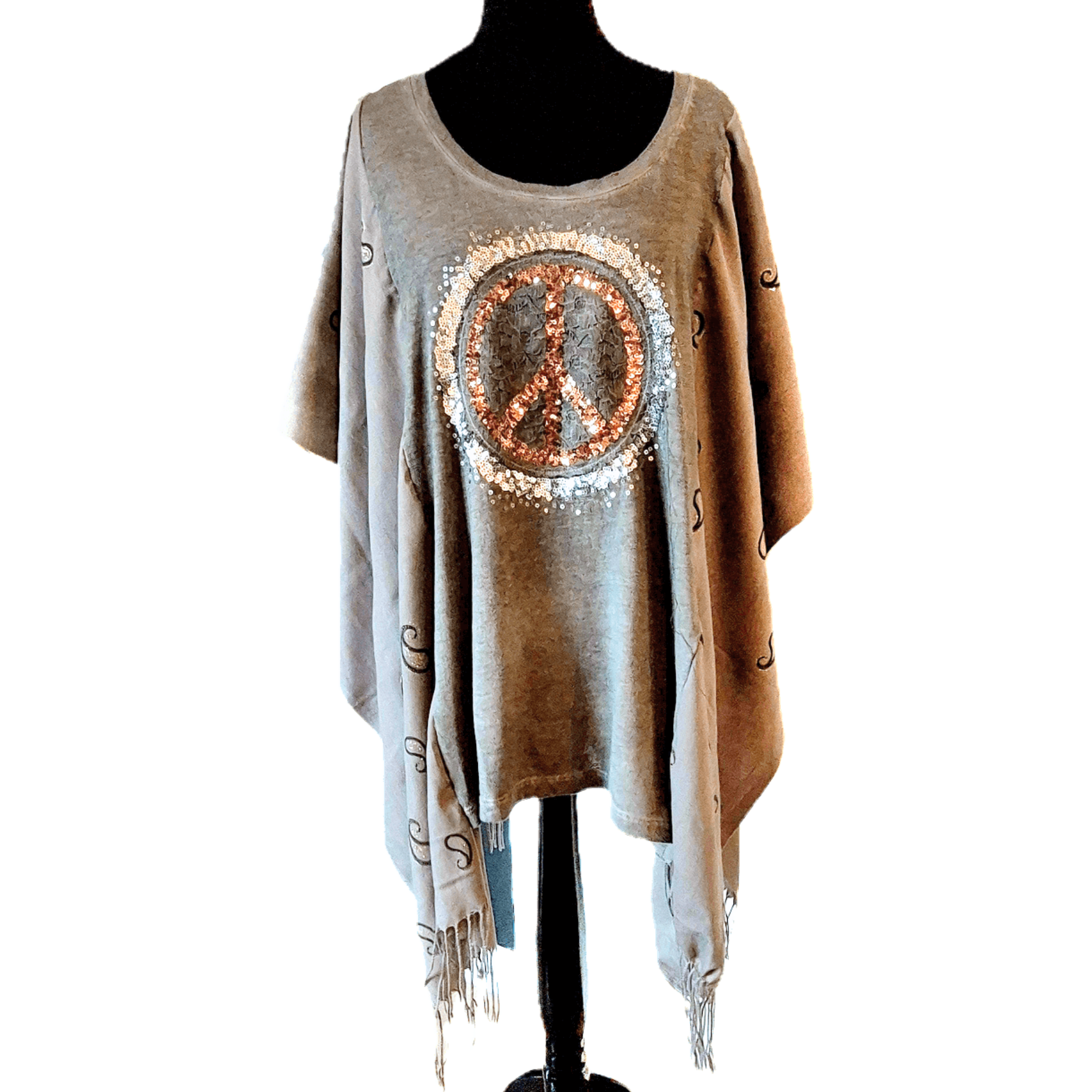 This relaxed-fit tee features soft, winged sleeves that flow like angelic energy, with hand-embroidered paisley accents and a shimmering sequin peace symbol at the heart — radiating healing and love wherever you go.