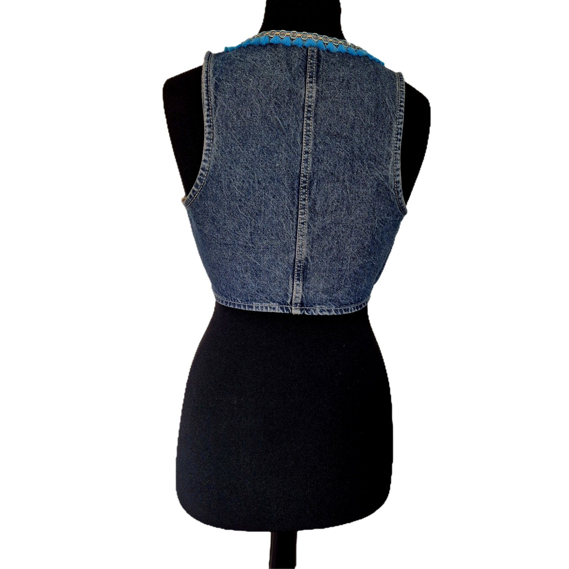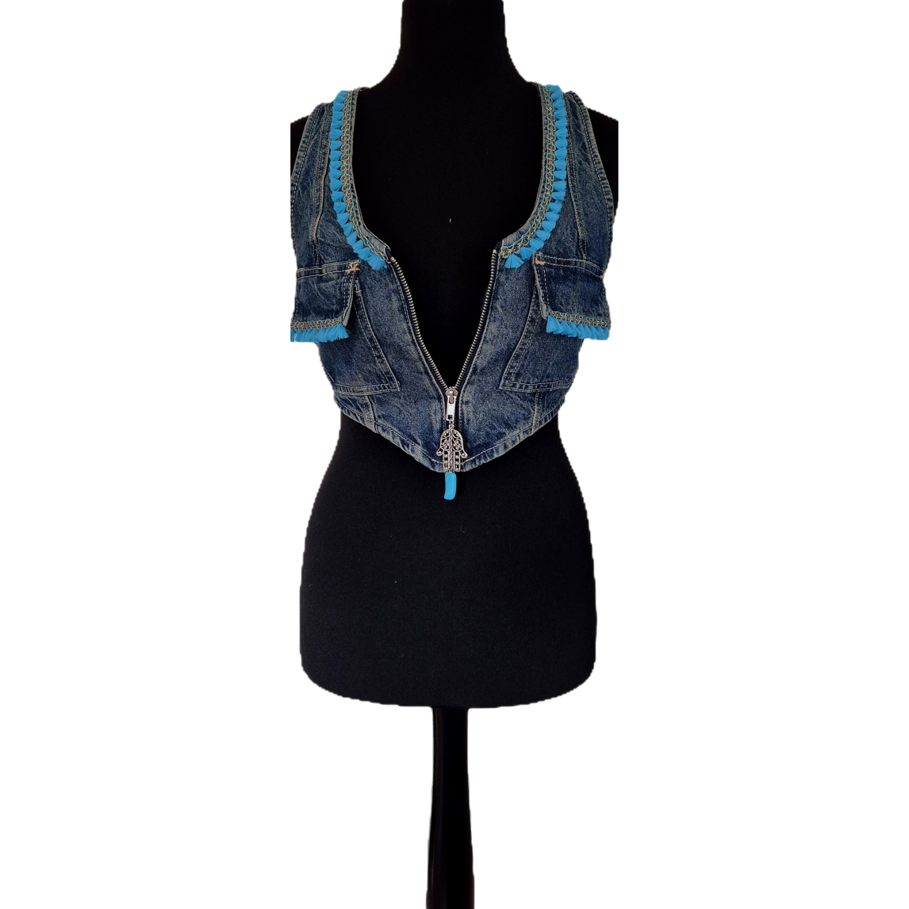 Feel the power of healing expression with Elyra, a unique upcycled denim top designed for the free spirit.