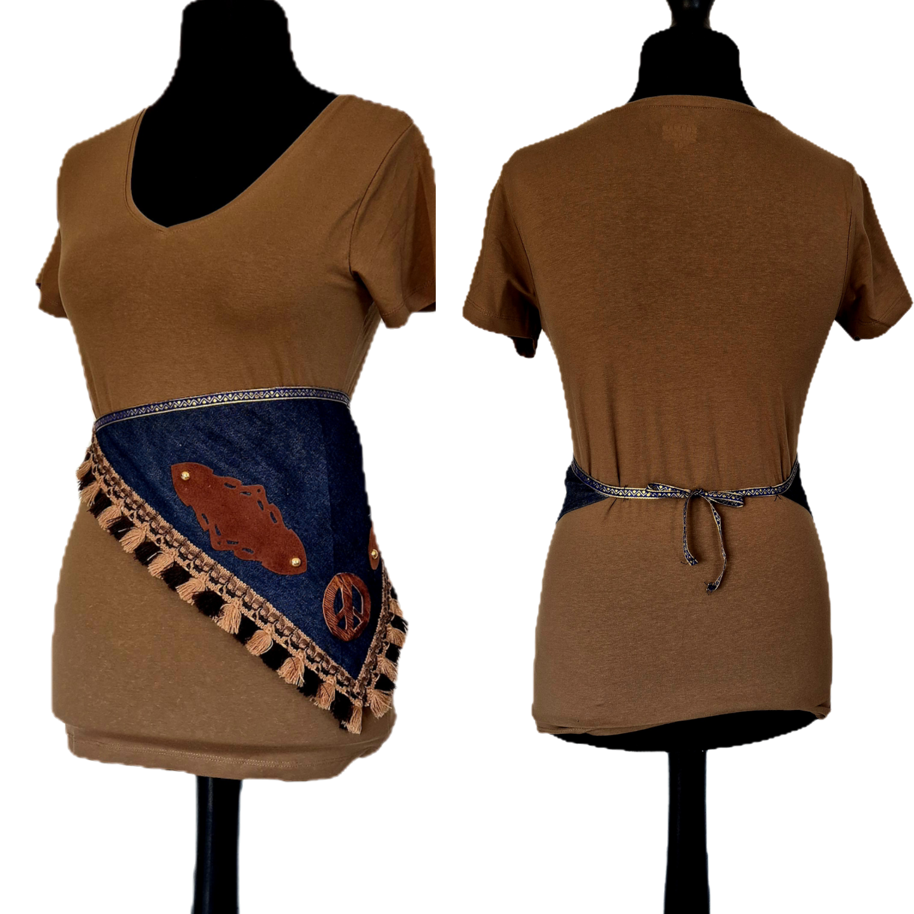 Materials: Repurposed denim, metal charms (including peace sign & feather), faux suede fringe