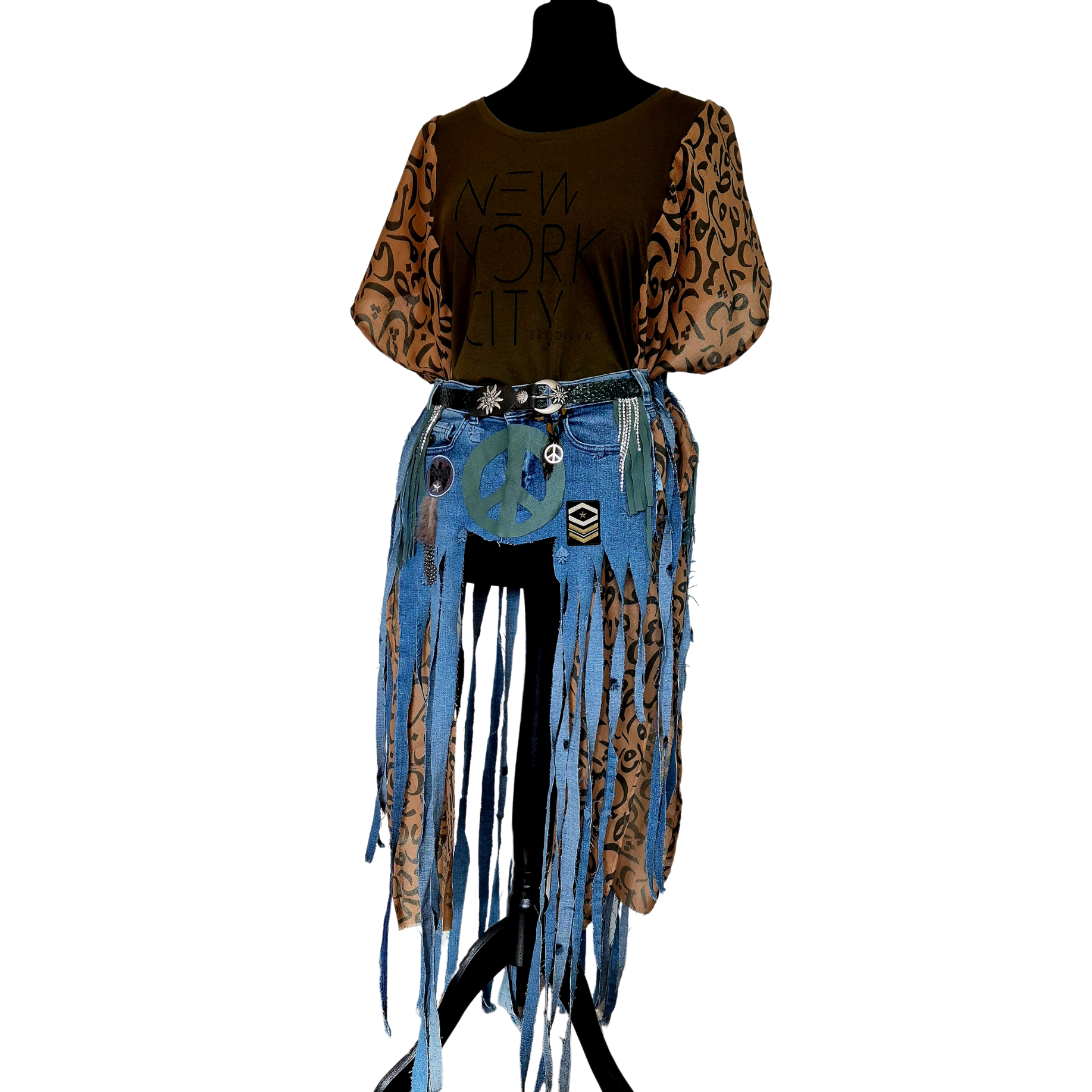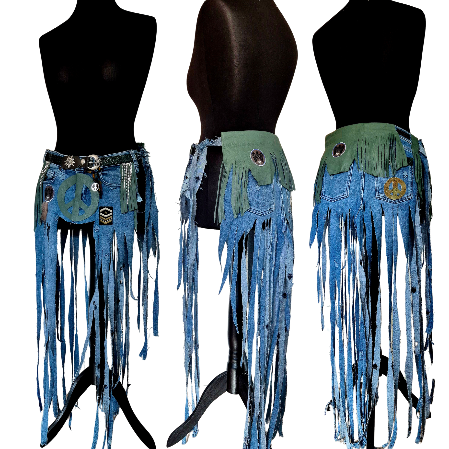 Unleash your inner wild with the Wild Soul β Peace Belt Skirt, a one-of-a-kind creation that blends raw energy, spiritual symbolism, and bold self-expression. This statement piece is made from upcycled denim, reborn into a flowing fringe skirt that moves with your rhythm.